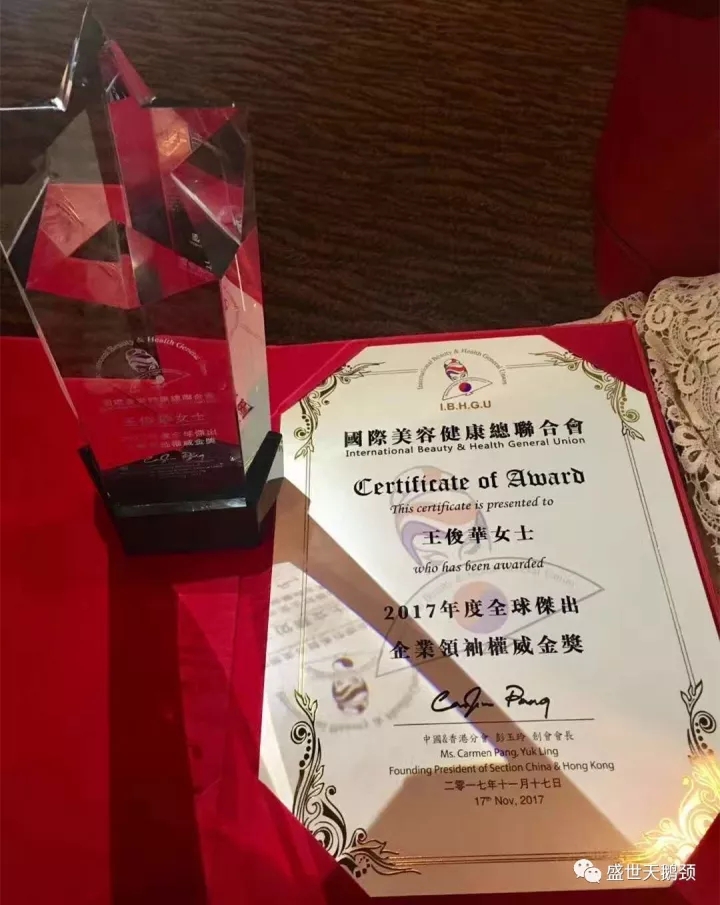 11月17日,國(guó)際美容健康總聯(lián)合會(huì)第三屆BHL證書頒授典禮暨技能展示大匯演,在香港亞洲國(guó)際博物館隆重召開。在此次頒授盛典上,盛世集團(tuán)董事長(zhǎng)王俊華女士榮獲“2017年度全球杰出企業(yè)領(lǐng)袖權(quán)威金獎(jiǎng)”。